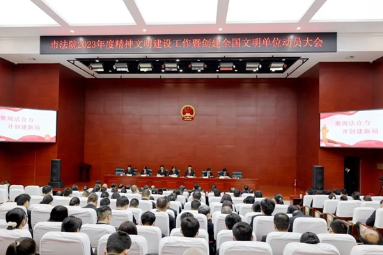 会议首先对2022年度精神文明建设工作表现突出的庭室和干警进行了表彰。随后,党组成员、政治部主任刘坤宣读了《周口市中级人民法院2023年精神文明建设工作实施方案》,对2023年争创全国文明单位工作进行具体安排部署。最后,党组书记、院长马军杰作动员讲话。
