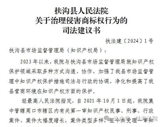 据悉,扶沟法院自2021年10月1日集中管辖周口市辖区内有关第一审知识产权民事、刑事、行政案件起,案件大幅度增长,案件类型多样。近日,在审理河南某乳业集团有限公司诉被告扶沟县某超市等8件侵害商标权纠纷案件中,发现该系列案件具有社会群体性,双方矛盾尖锐。考虑到该批侵害商标权纠纷案件涉及社会群体面较性广,为最大程度地降低社会影响,维护中小微市场主体的合法利益,保护知识产权,打击假冒伪劣产品,同时为贯彻习近平总书记关于“把非诉纠纷解决机制挺在前面”的重要指示精神,加强诉源治理,节约诉讼资源。依据相关法律规定,特作出上述司法建议。