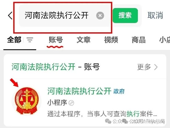 打开微信,点右上角“搜索”图标,直接输入“河南法院执行公开”,第一个就是它!