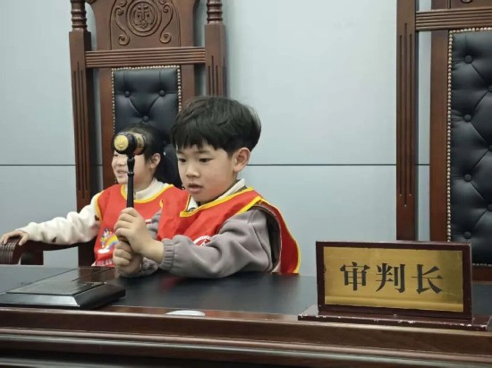 随后,师生们来到审判法庭。少年庭庭长张丽亚结合幼儿认知特点,细致讲解法庭布局、法徽、法槌、法袍的含义与作用,普及基础法律知识。为增强体验感,张丽亚邀请小朋友们走上审判席,沉浸式扮演“小法官”“公诉人”“辩护人”,亲身感受司法的庄严与权威。