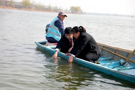 世界水日,龙湖之畔水光潋滟。环资庭干警乘船深入龙湖核心水域,逐水巡查、实地查看水质,向湖区管护人员、周边商户解读《生态环境法典》《湿地保护法》,以案释法讲明破坏生态环境的法律责任。